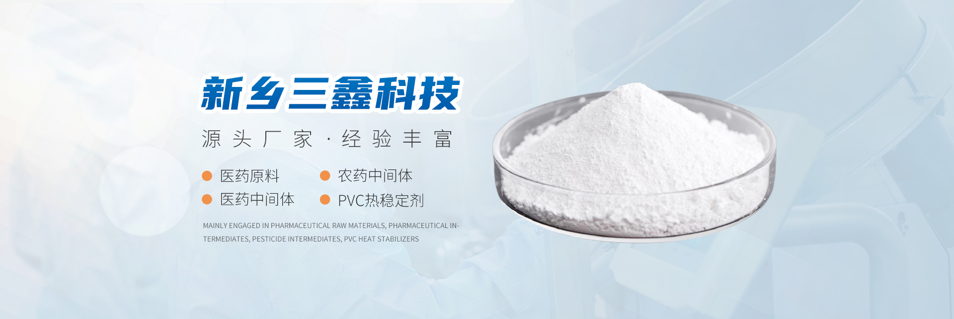 新鄉(xiāng)市三鑫科技有限公司主要從事醫(yī)藥原料、醫(yī)藥中間體、農(nóng)藥中間體、PVC熱穩(wěn)定劑、精細化學(xué)品和有機中間體。